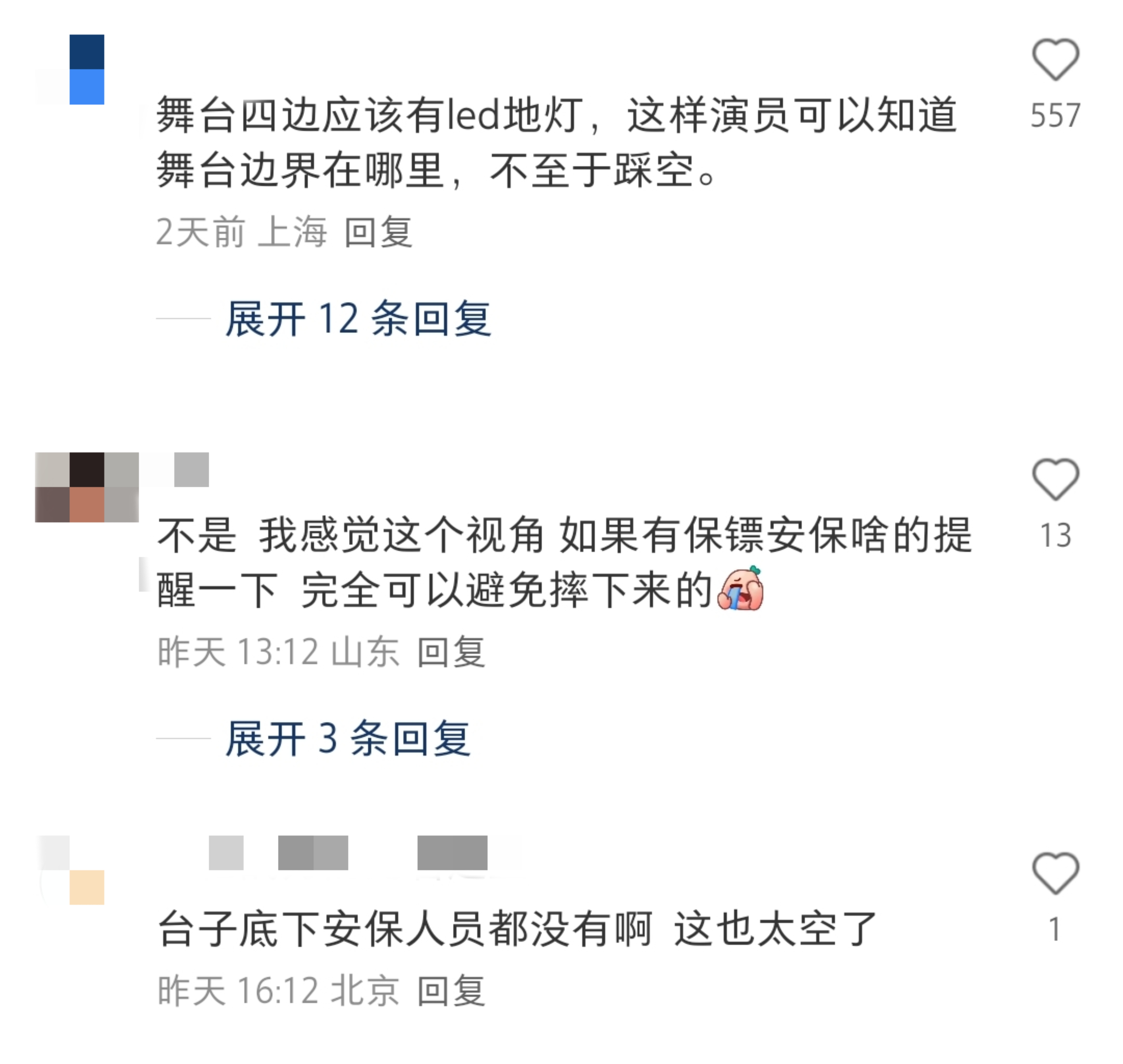 更有观众结合过往案例提出具体建议:在T台狭窄或边缘区域铺设防护垫,就能防住歌手因表演投入踩空的情况;还有人直言,“若当时有保镖或工作人员在侧及时提醒,这场意外本可避免。”