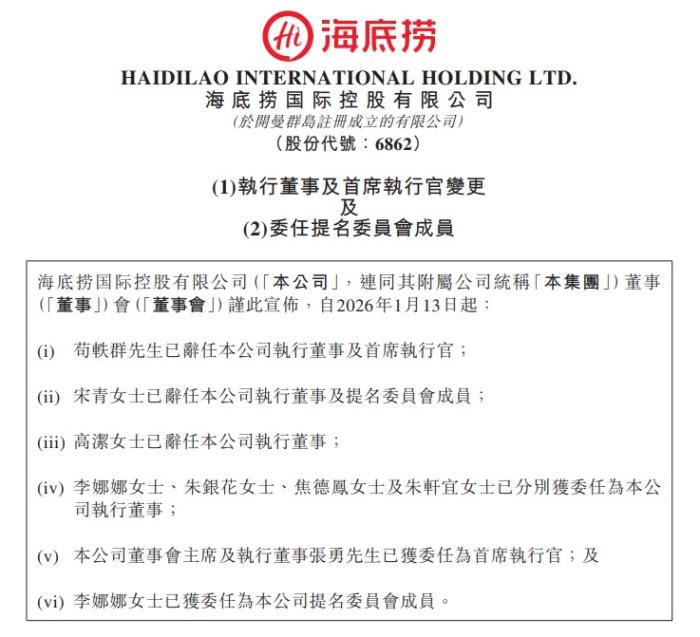 1月13日,海底捞发布公告称,自2026年1月13日起苟轶群已辞任公司执行董事及首席执行官,董事会主席兼执行董事张勇已获委任为公司首席执行官,自2026年1月13日起生效。