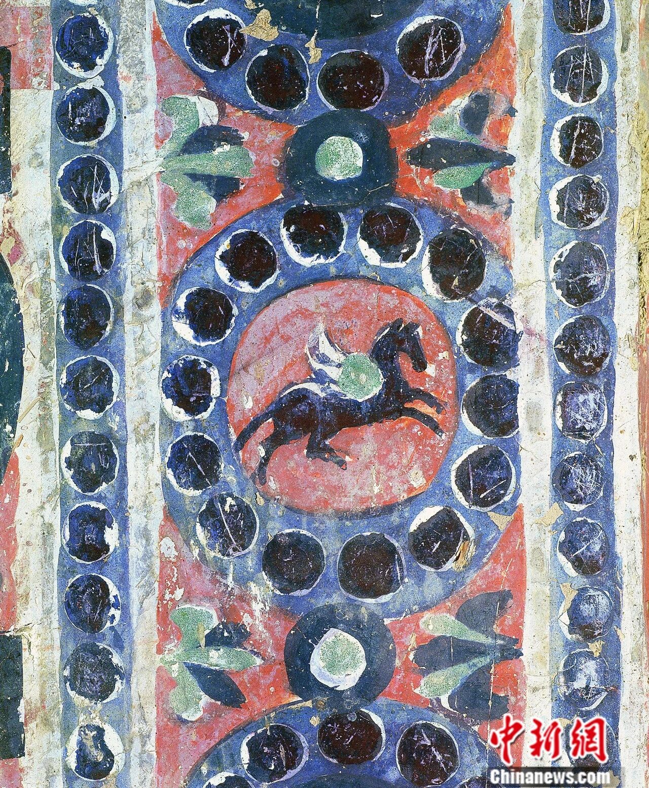出现在隋代多个洞窟中的“联珠翼马纹”,最能体现“东西合璧”的马形象。该纹饰源自波斯萨珊王朝,将圆形的小珠子连起来,形成一个纹样的骨架,有圆形的,还有菱形的;有单层,也有双层的;但中国画师并未照搬,而是将中华文化中的审美理念逐渐融入其中,以对雉、翔凤、游麟等传统吉瑞图案替代异域文化中的形象,形成了具有中华文化特色的联珠纹。